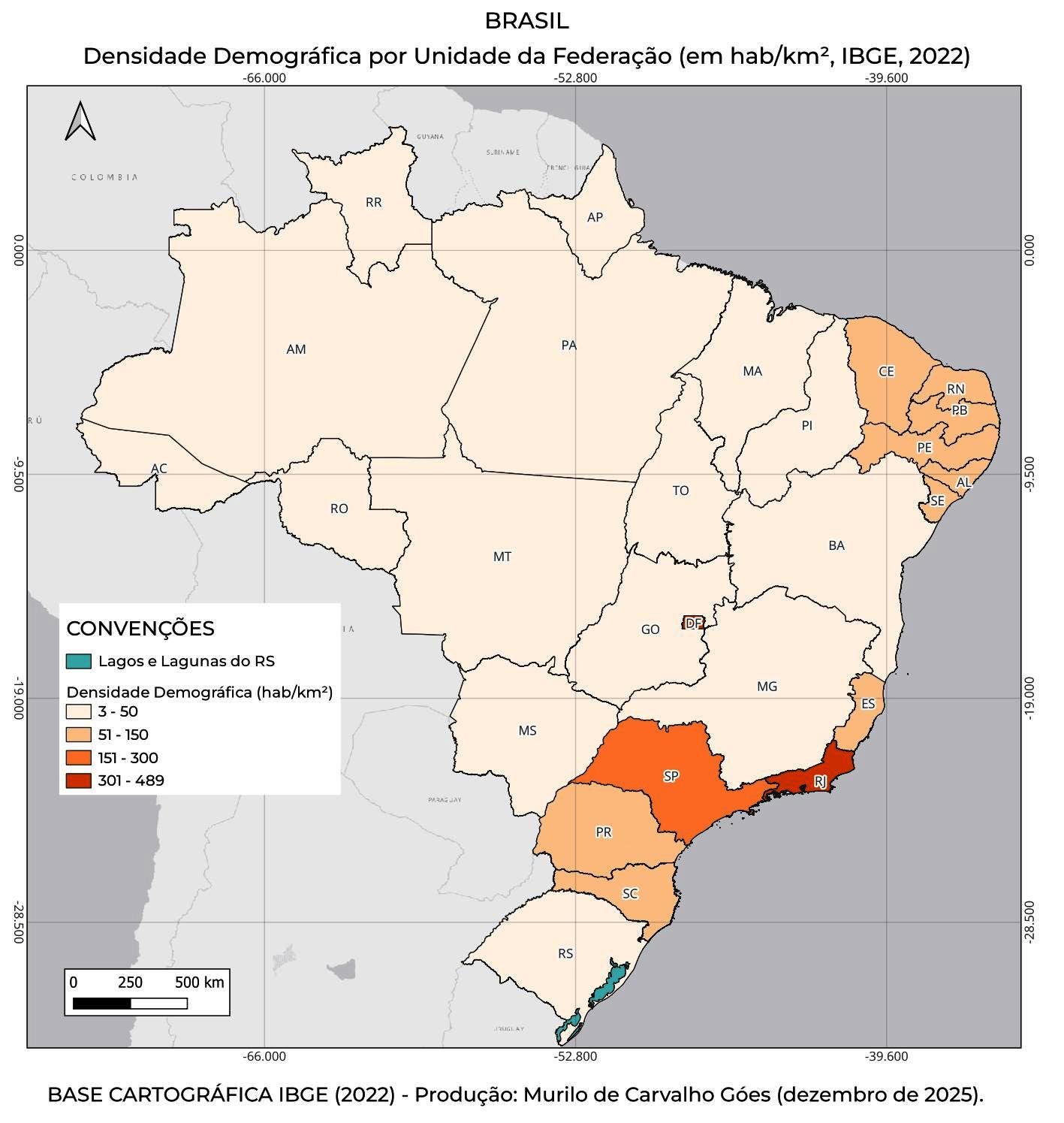 A densidade demográfica do Brasil é de aproximadamente 25 habitantes por km², índice justificado pelo vasto território do país, que é de cerca de 8.510.345 km². Os estados da Região Sudeste e Sul apresentam as maiores densidades demográficas, assim como as cidades localizadas em regiões metropolitanas e alguns importantes centros regionais. Sobre as Unidades da Federação, Amazonas, com 2,53 hab/km², tem a menor densidade demográfica; por sua vez, São Paulo, Rio de Janeiro e Distrito Federal tem densidade demográficas acima de 300 hab/km². Uma curiosidade: Segundo o IBGE (2022), Taboão da Serra, na Grande São Paulo, é o município com a maior densidade demográfica do Brasil, com 273.542 habitantes, uma área de aproximadamente 20,4 km², resultando numa densidade populacional de 13.416,81 hab/km². A maior parte das UF’s brasileiras (15 estados) possuem densidades demográficas menores que 50 hab/km².