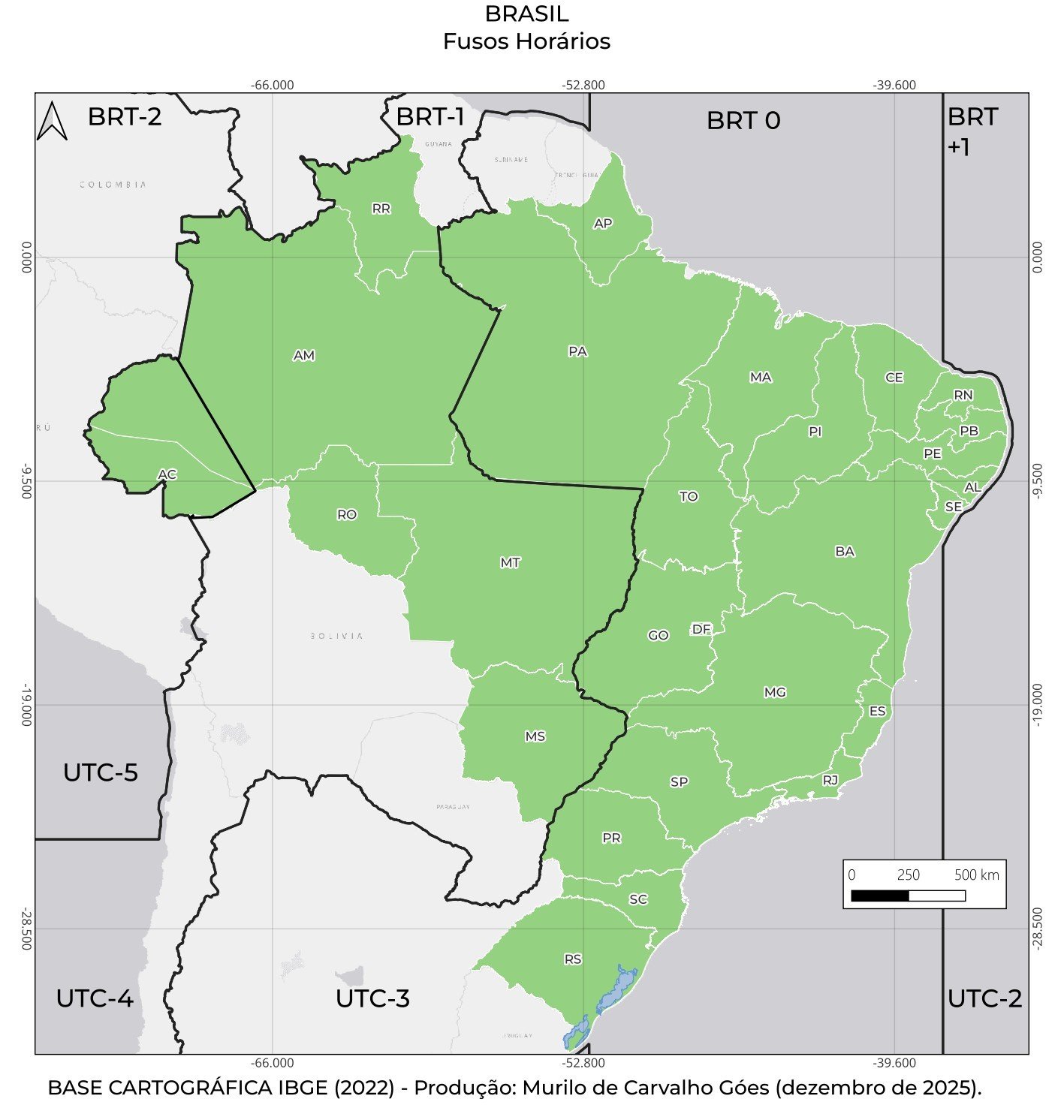 - UTC-5: Acre e parte do sudoeste do Amazonas (BRT-2).