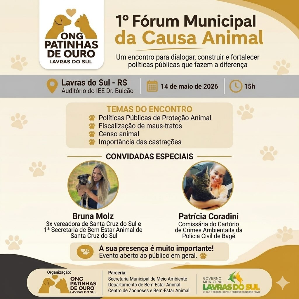 O evento terá, como convidadas especiais, Bruna Molz (a primeira Secretária de Bem Estar Animal de Santa Cruz do Sul) e Patrícia Coradini (Comissária do Cartório de Crimes Ambientais da Polícia Civil de Bagé).