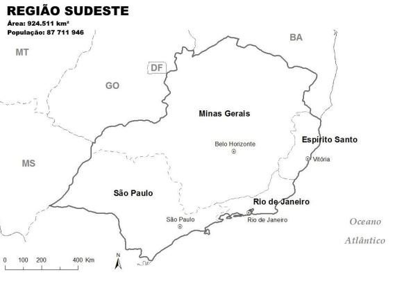 A Região Sudeste (composta pelos estados de Espírito Santo, Rio de Janeiro, Minas Gerais e São Paulo), é a primeira em população e quarta maior em superfície do Brasil.